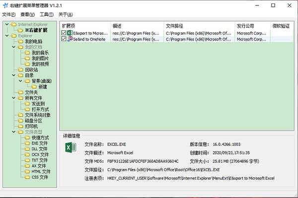 1、RightMenuMgr窗口的左侧窗格列出了IE浏览器和Explorer文件资源管理器两大项目,展开Explorer又可以看到更多的项目,选中某个项目,就会在右键窗格中显示该项目的右键菜单选项。如图: