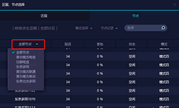 3、进去区服、节点选择界面之后,我们可以看到有许多个显示不一样的延迟、丢包评分以及不同模式的节点,可以在“模式选择”按钮中选择不同模式,可通过勾选单个或多个进行模式的选择切换