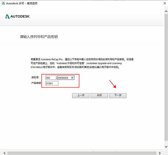 9、输入Autodesk ReCap Pro 2021序列号【666-69696969】和密钥【919M1】(秘钥自动生成不用管),点击下一步继续;