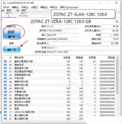3、当你打开以后,会清楚的看到自己电脑硬盘的一些基本信息,我们看到本机的健康状态为88%,温度为48℃;