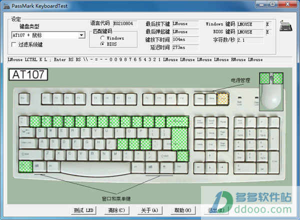 1、测试时,敲下键盘上的某个键,在软件测试图上的对应键位上,就会出现“绿色斜纹”,这表示该键位已经通过测试,没有问题。如果某键击下,而测试图中的对应键位没有反应时,那么,你手中的键盘就有问题了。如下图所示: