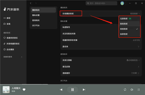 2、在播放相关中选择“在线播放音质”,下拉菜单中你就可以按照自己的需求进行选了哦。