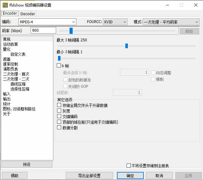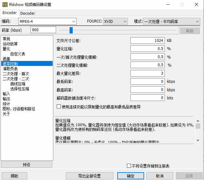 2、在【Encoder】编码器栏目中,包括【常规】、【运动估算】、【量化】、【遮盖】、【速率控制】、【演职员表】、【曲线压缩】等功能选项,