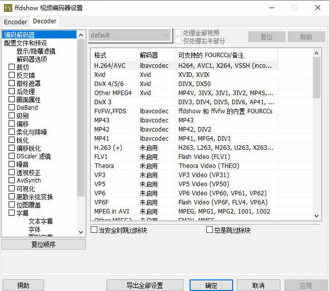4、切换到【Decoder】解码器栏目中,可看到支持的格式和解码器,用户可根据需求进行选择,