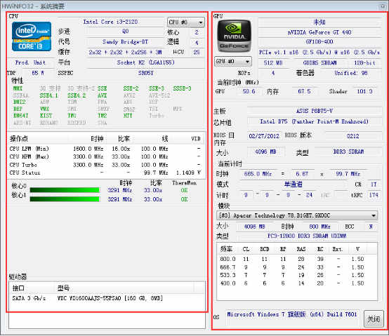 打开软件,左侧是CPU的相关信息包括名称、频率、各个实际核心的频率、硬盘和光驱的参数等;右侧主要显示芯片、主板和芯片组的相关信息。